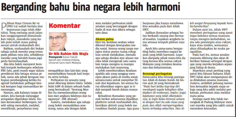Note: Akhbar ini disiarkan oleh Berita Harian pada 4.6.2018